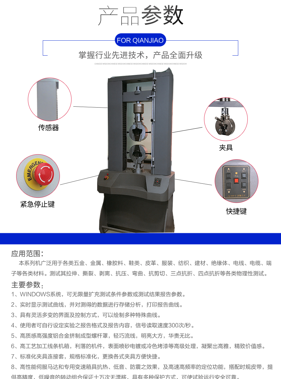 KD-999系列機(jī)廣泛用于各類五金、金屬、橡膠料、鞋類、皮革、服裝、紡織、建材、絕緣體、電線、電纜、端子等各類材料。測(cè)試其拉伸、撕裂、剝離、抗壓、彎曲、抗剪切、動(dòng)態(tài)往復(fù)...