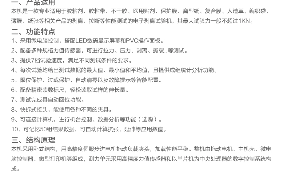 是一款專業(yè)適用于膠粘劑、膠粘帶、不干膠、醫(yī)用貼劑、保護(hù)膜、離型紙、復(fù)合膜、人造革、編織袋、薄膜、紙張等相關(guān)產(chǎn)品的剝離、拉斷等性能測(cè)試的電子剝離試驗(yàn)機(jī)。...